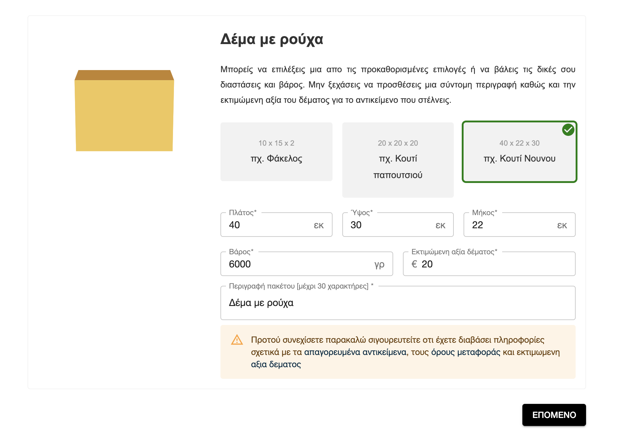 2. Συμπληρώνεις τις διαστάσεις και το βάρος του δέματός σου